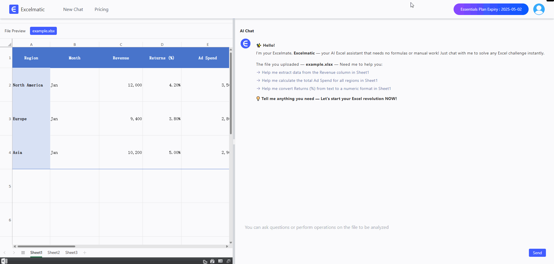 Excelmatic tears down that wall by making data analysis as intuitive as a conversation. Powered by advanced AI, it understands natural language, interprets your intent, and delivers results without requiring you to touch a formula or pivot table. Here’s how it works in three seamless steps:
