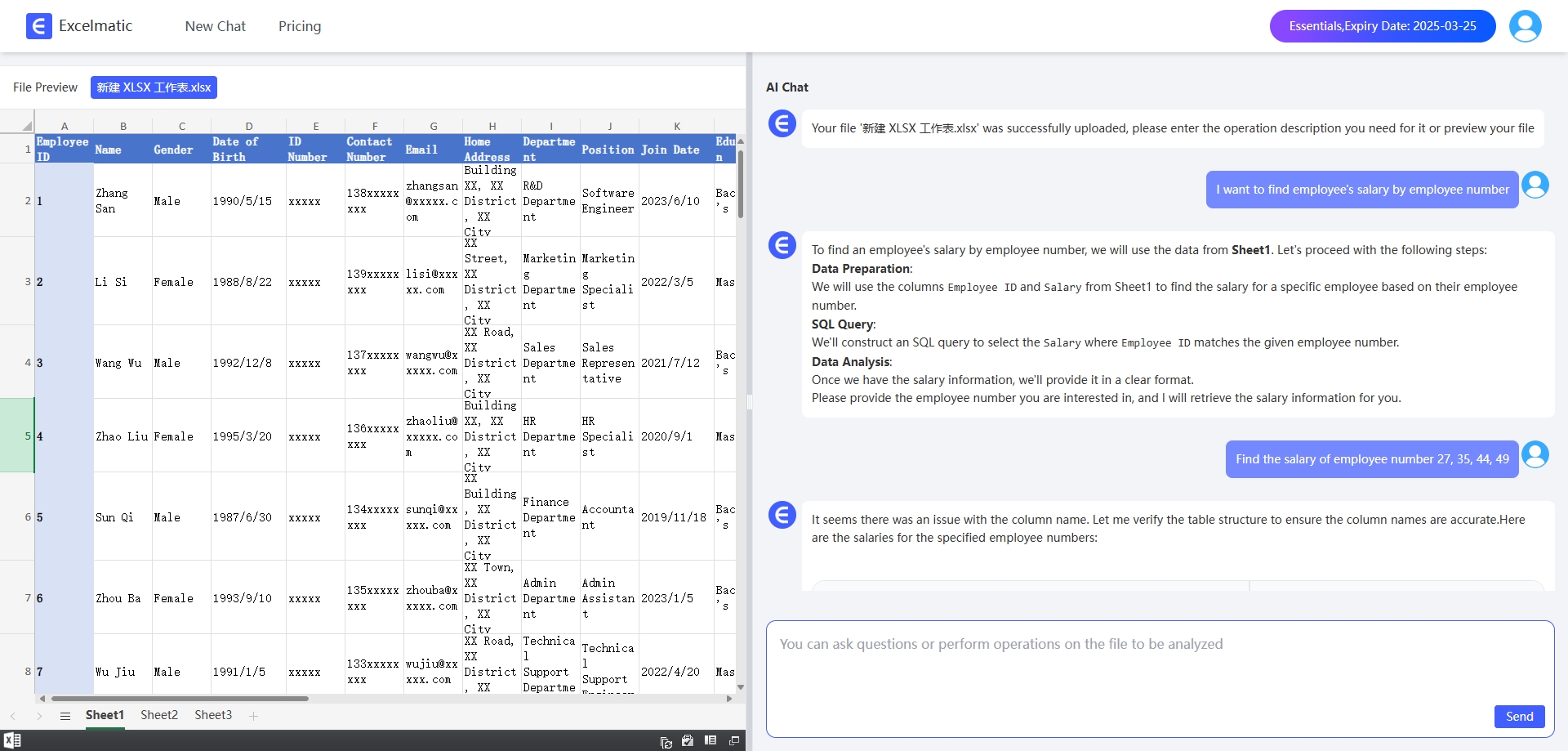 With Excelmatic, you can easily import Excel files without using VLOOKUP formulas, just by asking simple natural language questions. For example, all you need to say is “I want to find an employee's salary by employee number” and Excelmatic will automatically recognize the salary for the employee number you want to find.