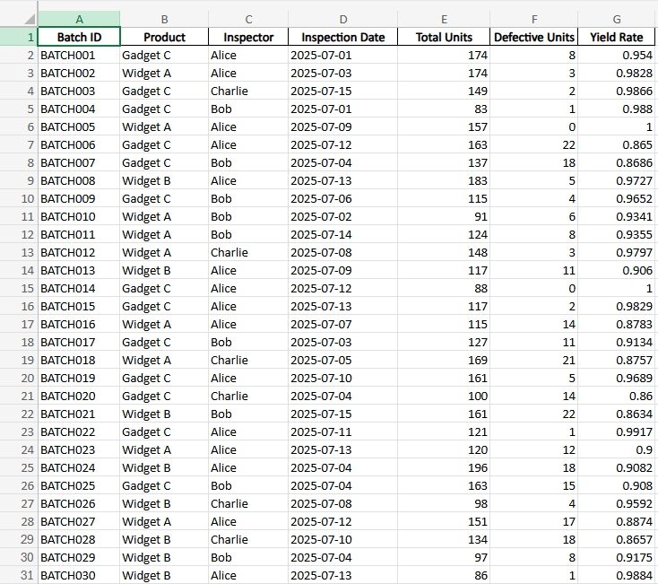 Let’s say you have a table of 30 inspection records. Each row includes batch ID, product type, inspector, inspection date, total units, defective units, and calculated yield.